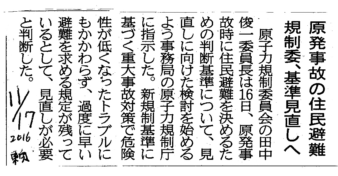 [2016_11_17_03]原発事故の住民避難 規制委、基準見直しへ(東奥日報2016年11月17日)