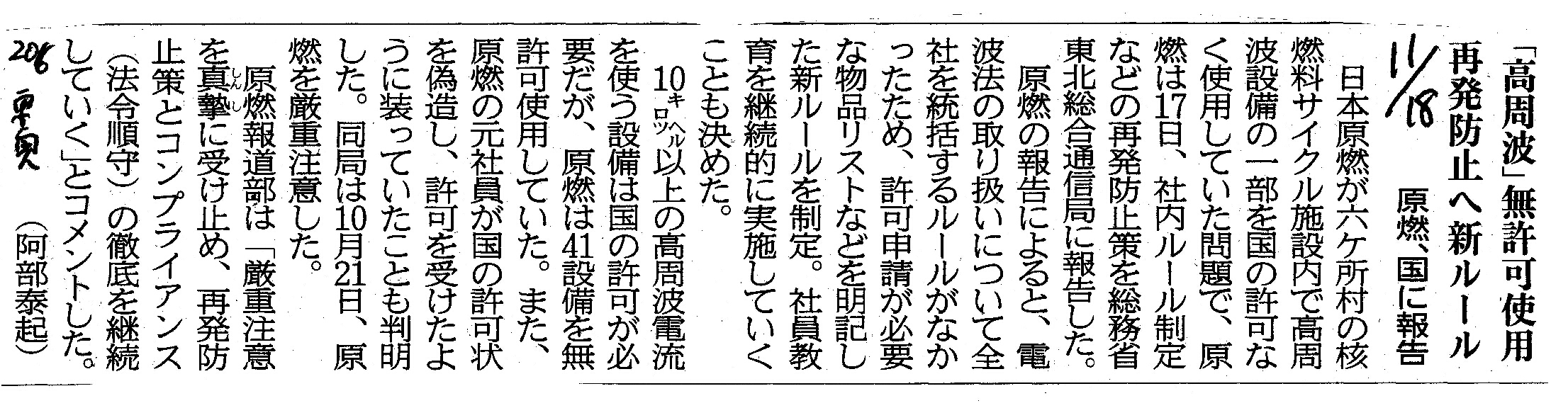 | [2016_11_18_01]「高周波」無許可使用 再発防止へ新ルール 原燃、国に報告(東奥日報2016年11月18日) |