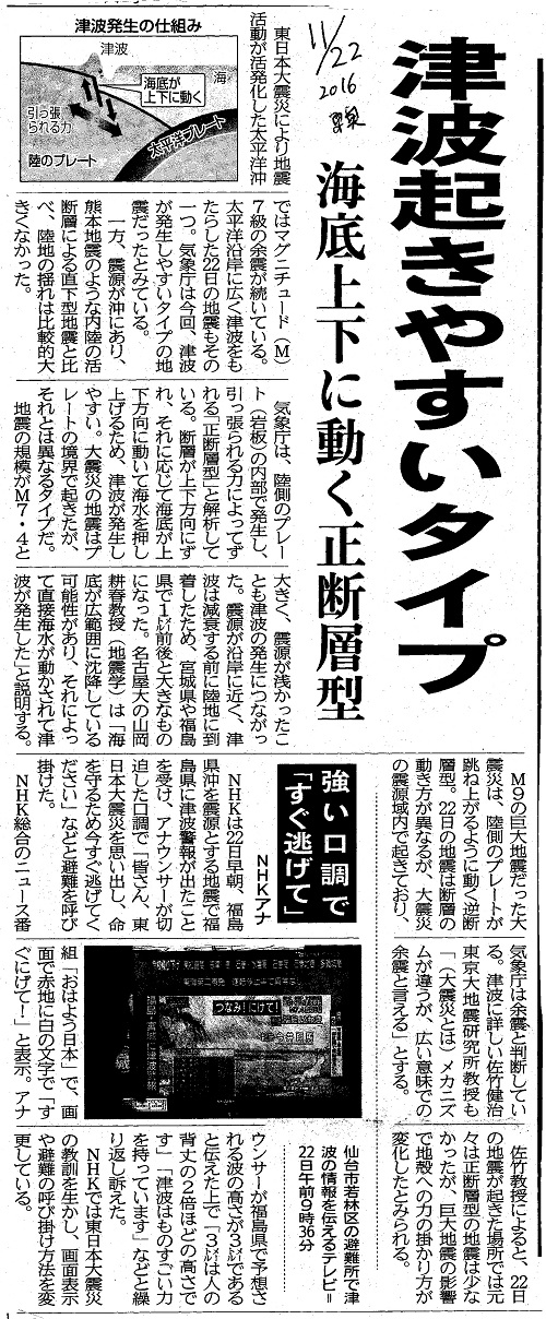 | [2016_11_22_06]津波起きやすいタイプ 海底上下に動く正断層型 強い口調で「すぐ逃げて」NHKアナ(東奥日報2016年11月22日) |