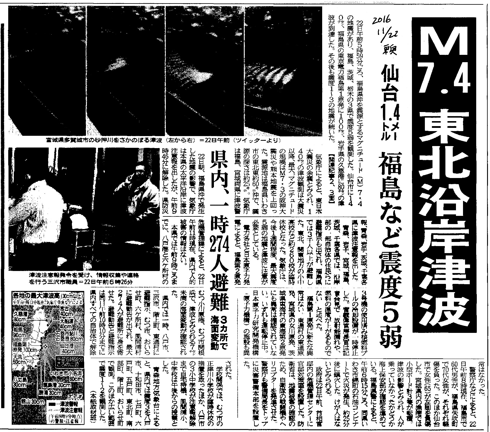 | [2016_11_22_25]M7.4 東北沿岸津波 仙台1.4メートル 福島など震度5弱 県内、一時274人避難 3ヵ所で海面変動(東奥日報2016年11月22日) |