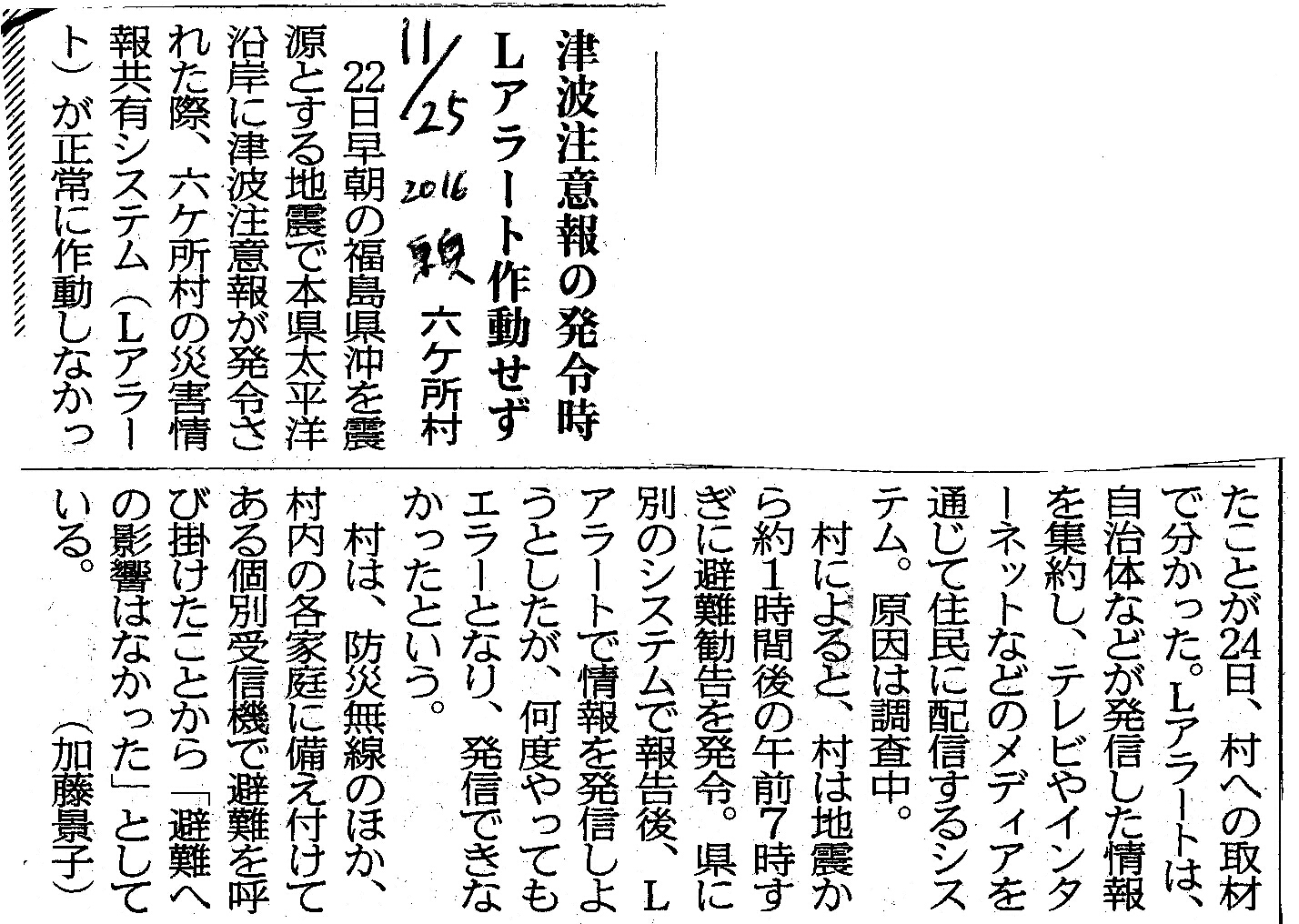 | [2016_11_25_07]津波注意報の発令時 Lアラート作動せず 六ヶ所村(東奥日報2016年11月25日) |