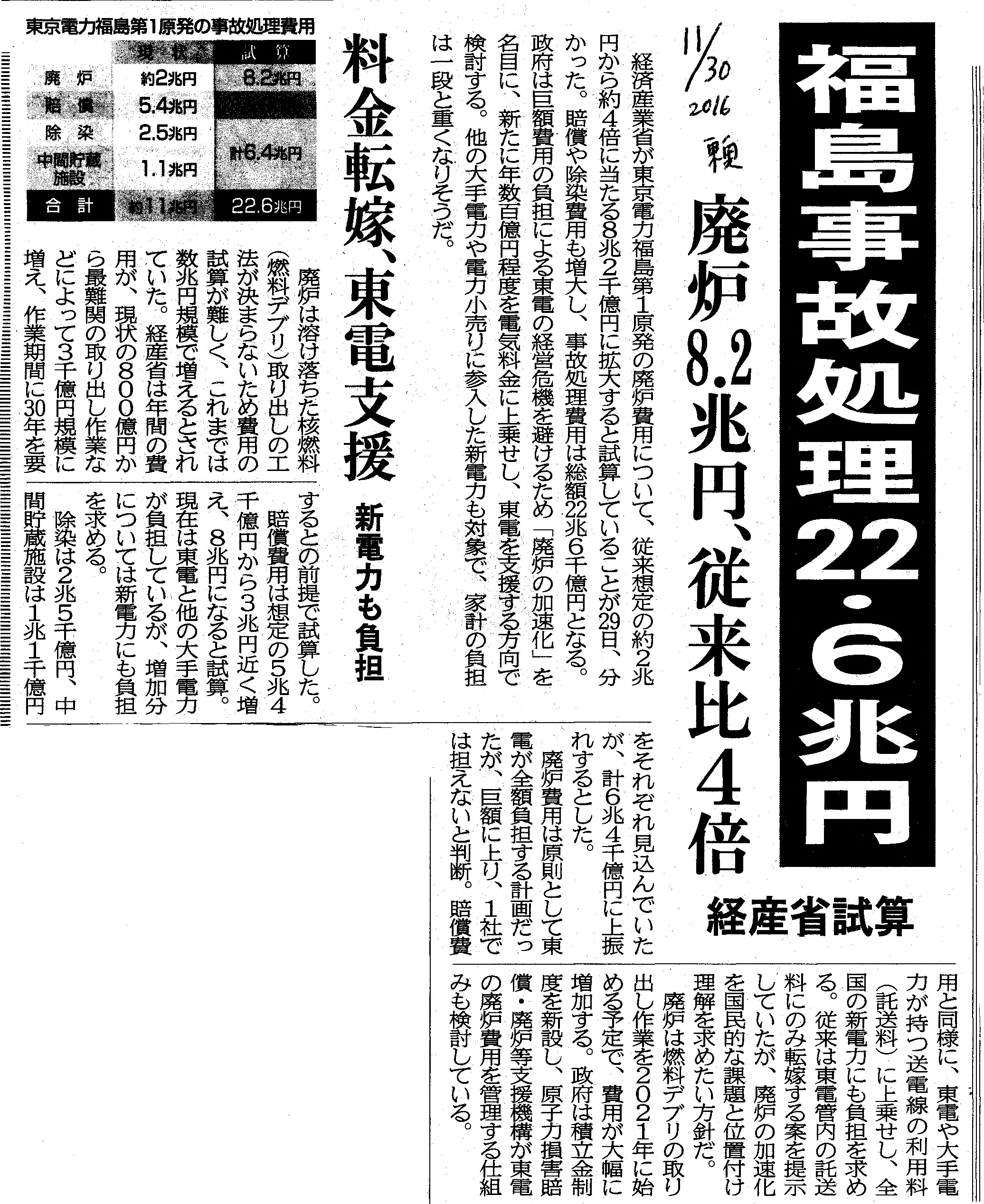[2016_11_30_02]福島事故処理22.6兆円 廃炉8.2兆円、従来比4倍 料金転嫁、東電支援 新電力も負担(東奥日報2016年11月30日)