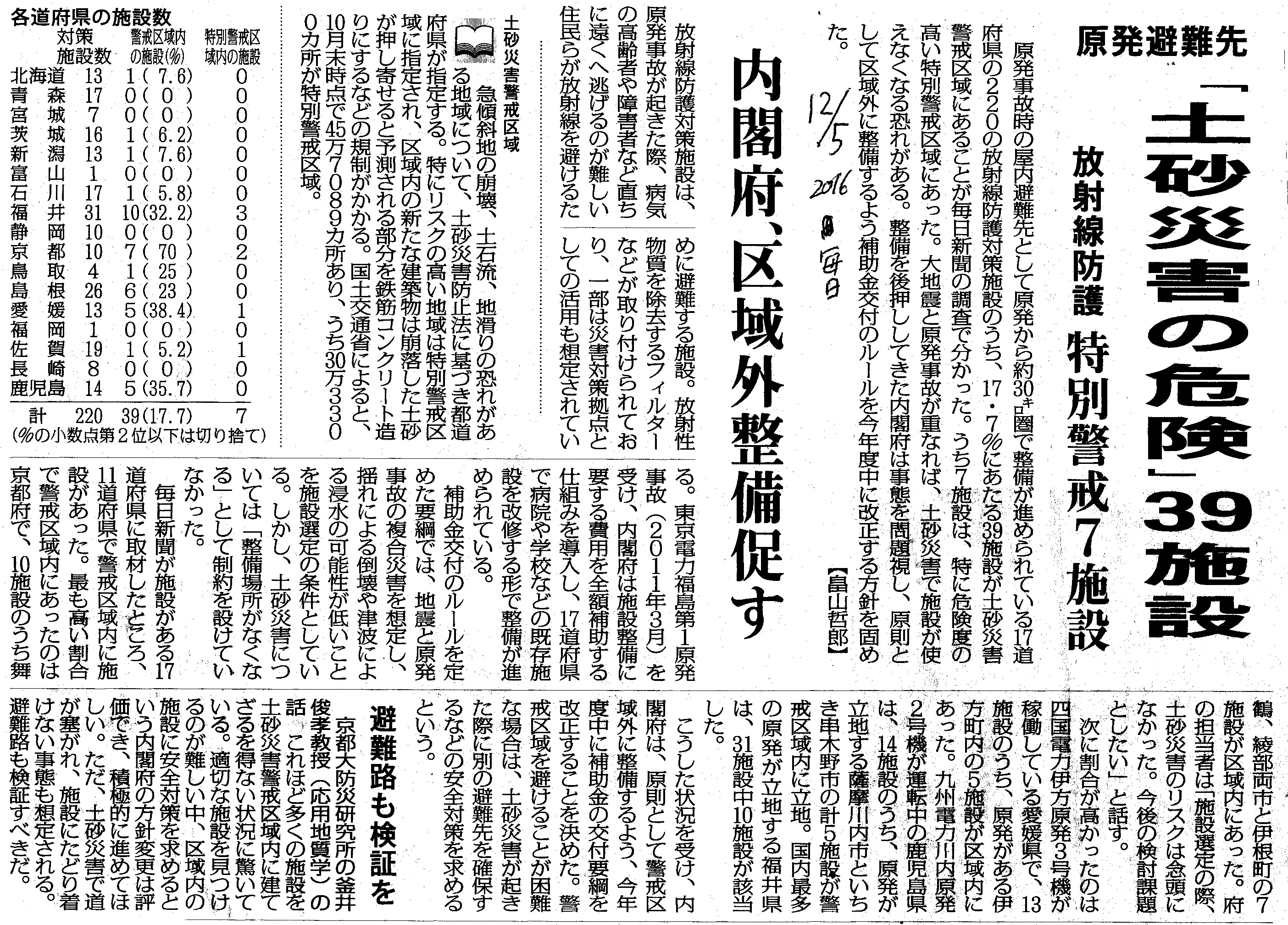 [2016_12_05_02]原発避難先 「土砂災害の危険」39施設 放射線防護 特別警戒7施設 内閣府、区域外整備促す 避難路も検証を(毎日新聞2016年12月5日)