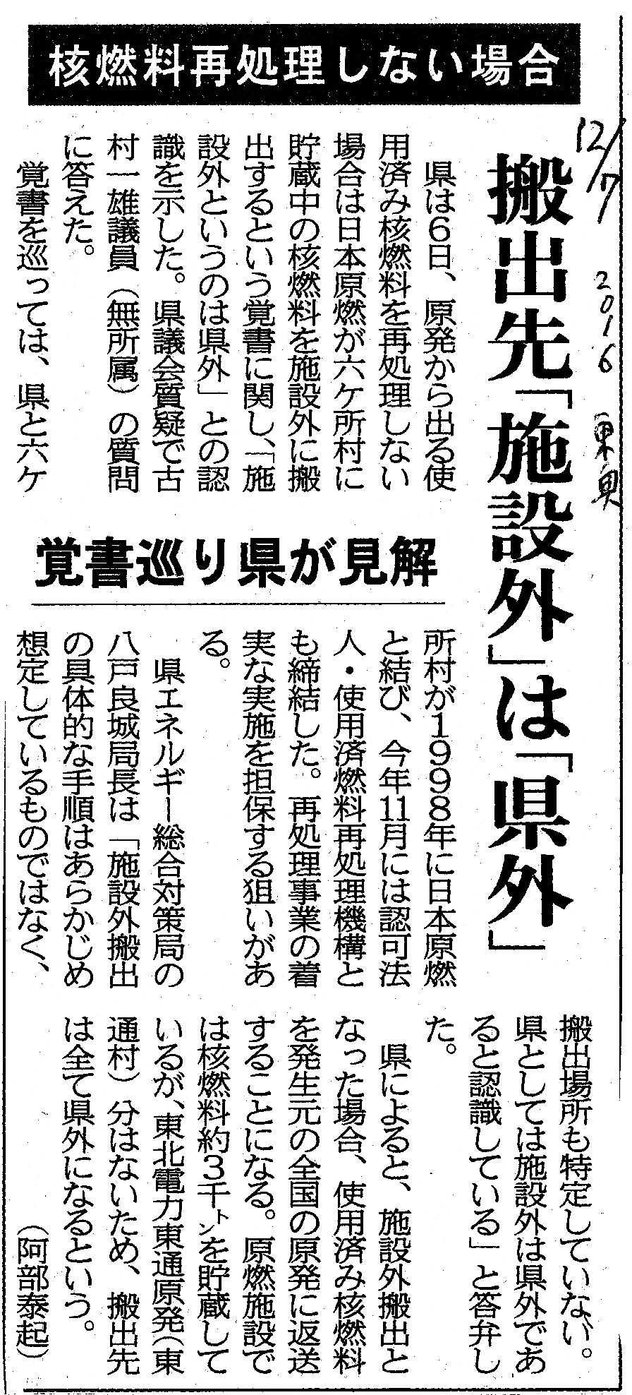 | [2016_12_07_03]核燃料再処理しない場合 搬出先「施設外」は「県外」 覚書巡り県が見解(東奥日報2016年12月7日) |