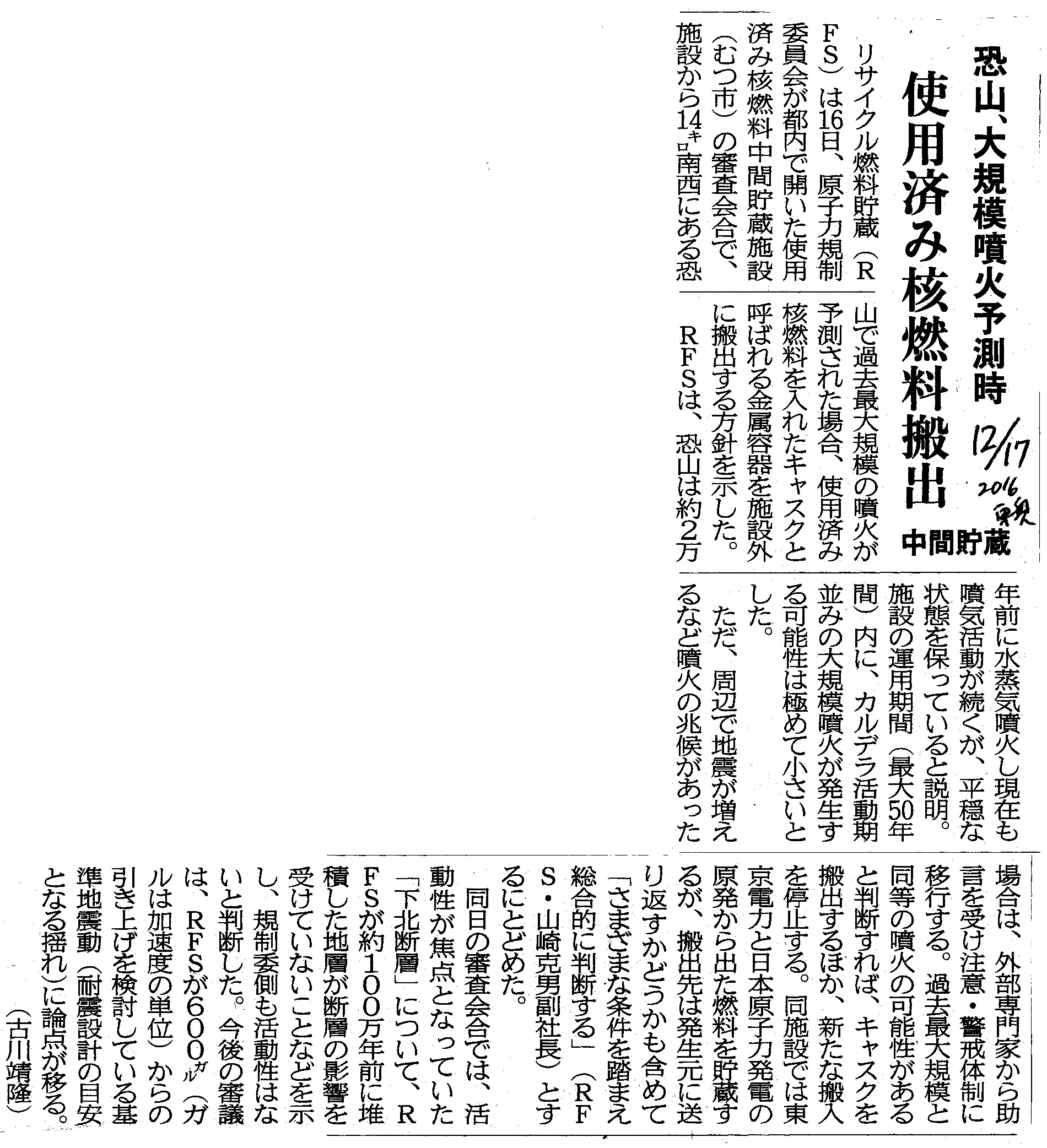 | [2016_12_17_02]恐山、大規模噴火予測時 使用済み核燃料搬出 中間貯蔵(東奥日報2016年12月17日) |