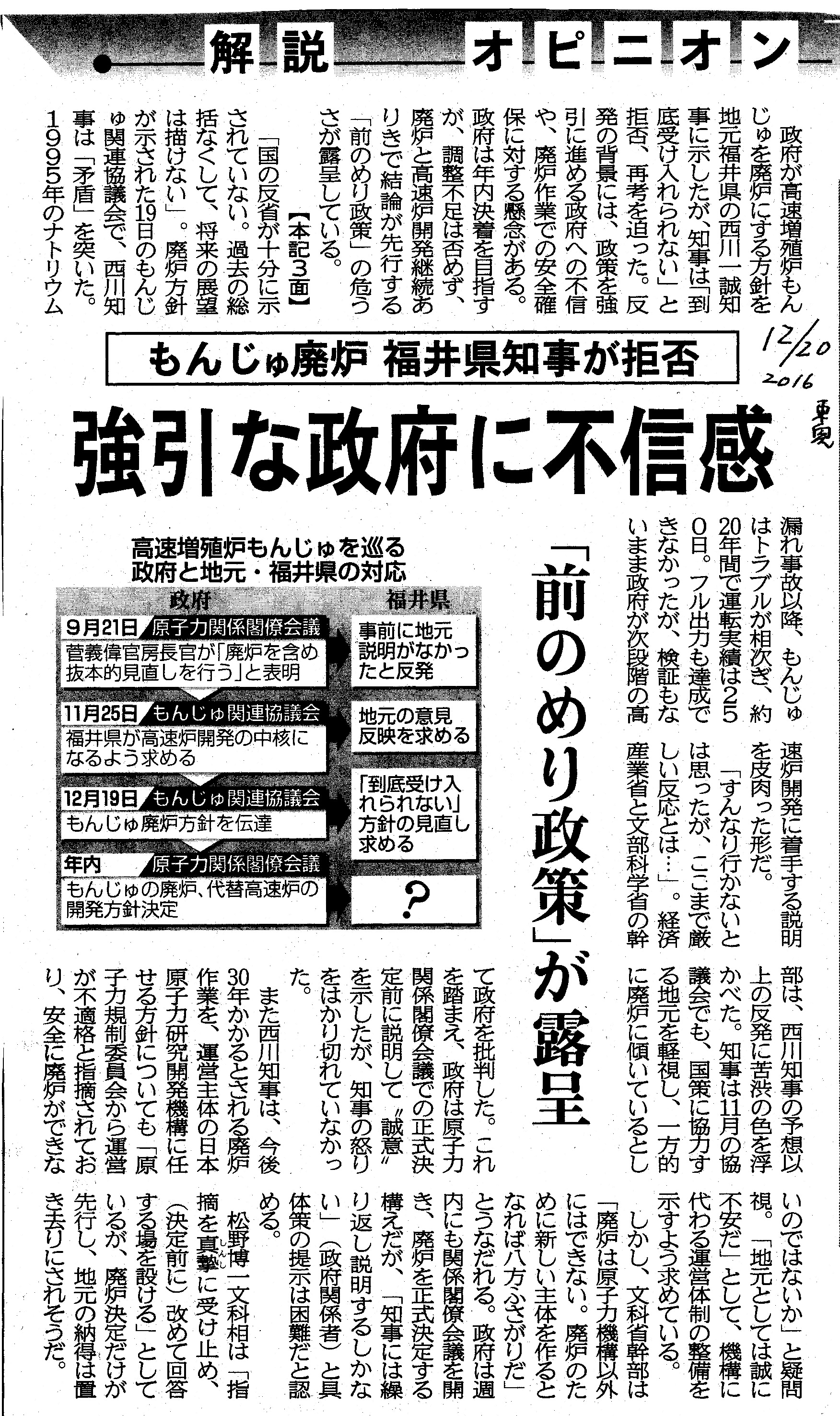 [2016_12_20_02]解決 オピニオン もんじゅ廃炉 福井県知事が拒否 強引な政府に不信感 「前のめり政策」が露呈(東奥日報2016年12月20日)