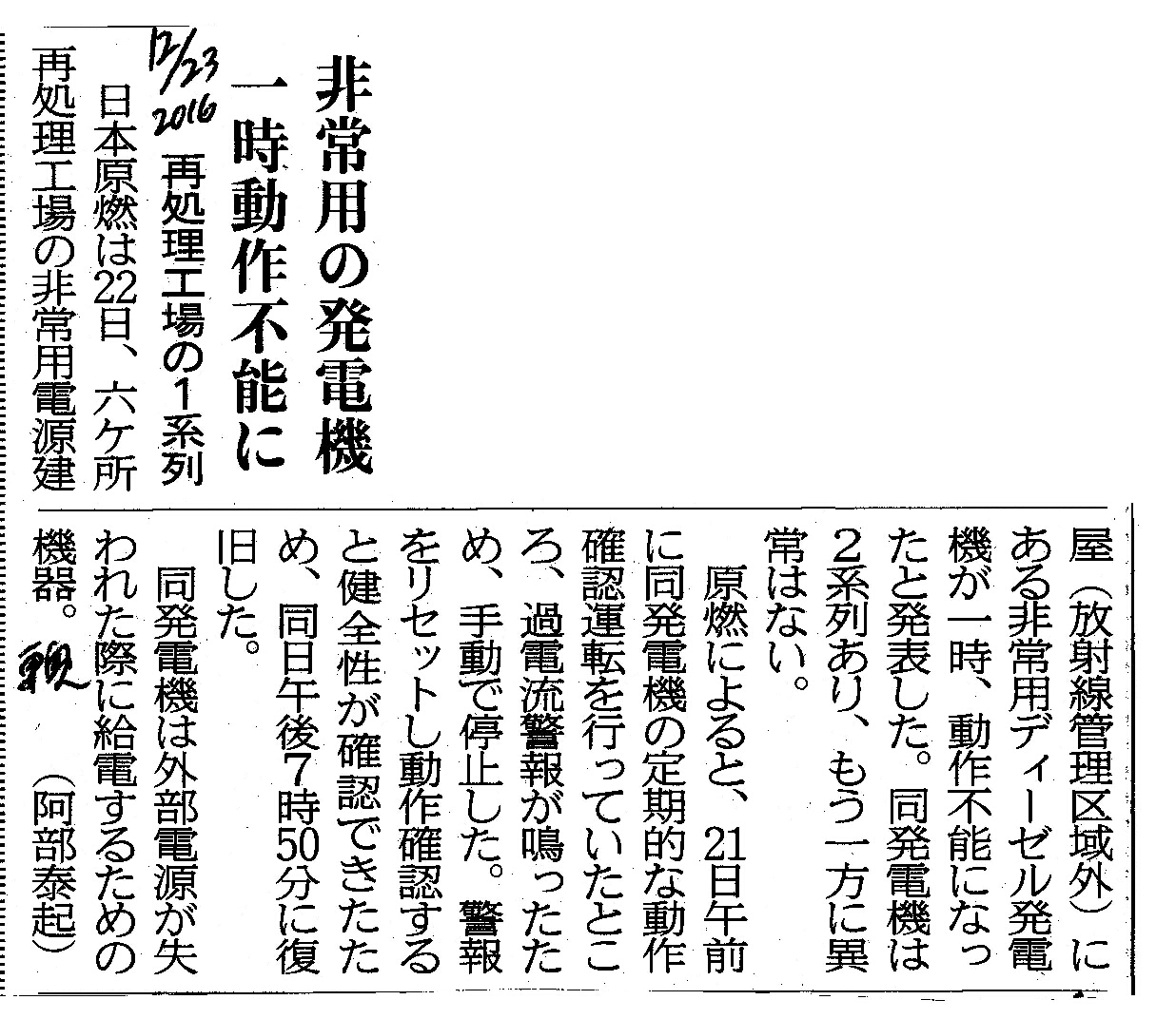 | [2016_12_23_02]非常用の発電機 一時動作不能に 再処理工場の1系列(東奥日報2016年12月23日) |