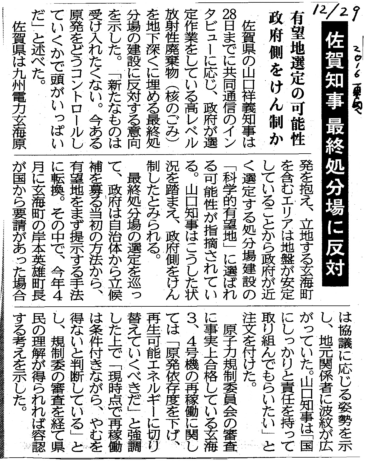 [2016_12_29_02]佐賀知事 最終処分場に反対 有望地選定の可能性 政府側をけん制か(東奥日報2016年12月29日)