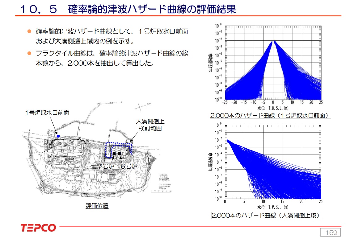 04:00 (前略) 1.2 津波に対する防護の考え方と防潮堤の位置づけ ● 大湊側の敷地に設置する施設・設備 敷地の高さ(T.M.S.L.+12m)により津波から防護 防潮堤によらずに津波に対する防護が達成可能であることから防潮堤(大湊側)は基準津波を上回る規模の津波に備えた自主的な対策設備と整理した。 ● 荒浜側の敷地に設置する施設・設備 ※3号内緊対所及び同緊対所につながるアクセスルート 防潮堤により津波から防護 防潮堤により津波に対する防護を実現することから防潮堤(荒浜側)は「津波防護施設」と整理した。 荒浜側防潮堤に対して基準津波を設定した。 1.3 津波水位評価の検討方針 基準津波は,最新の科学的・技術的知見を踏まえ,波源海域から敷地周辺までの海底地形,地質構造及び地震活動性等の地震科学的見地から想定することが適切なものとして策定する。 地震による津波のほか,地すべりによる津波など,地震以外の要因及びこれらの組合せによるものを複数選定し,不確かさを考慮した数値シミュレーションを実施して策定する。 新規制基準に従い,供用期間中に施設に大きな影響を及ぼすおそれがある津波を評価した。 津波水位評価の検討方針フローを下記に示す。 なお,審査会合などでの議論を踏まえ,当初申請時から港湾内海底地形等の地形データを更新している。 (中略) 10.5 確率論的津波ハザード曲線の評価結果 確率論的津波ハザード曲線として,1号炉取水口前面および大湊側遡上域内の例を示す。 フラクタイル曲線は,確率論的津波ハザード曲線の総本数から,2,000本を抽出して算出した。 ![]() |