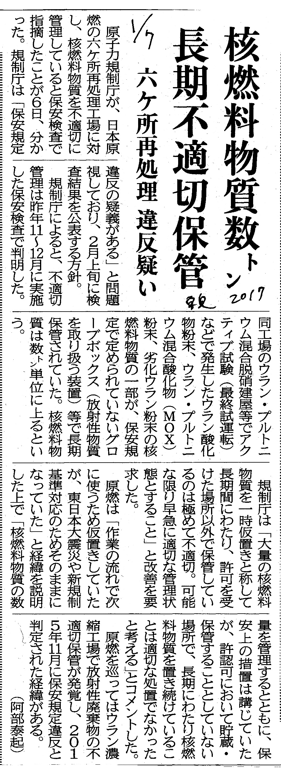 | [2017_01_07_01]核燃料物質数トン 長期不適切保管 六ヶ所再処理 違反疑い(東奥日報2017年1月7日) |