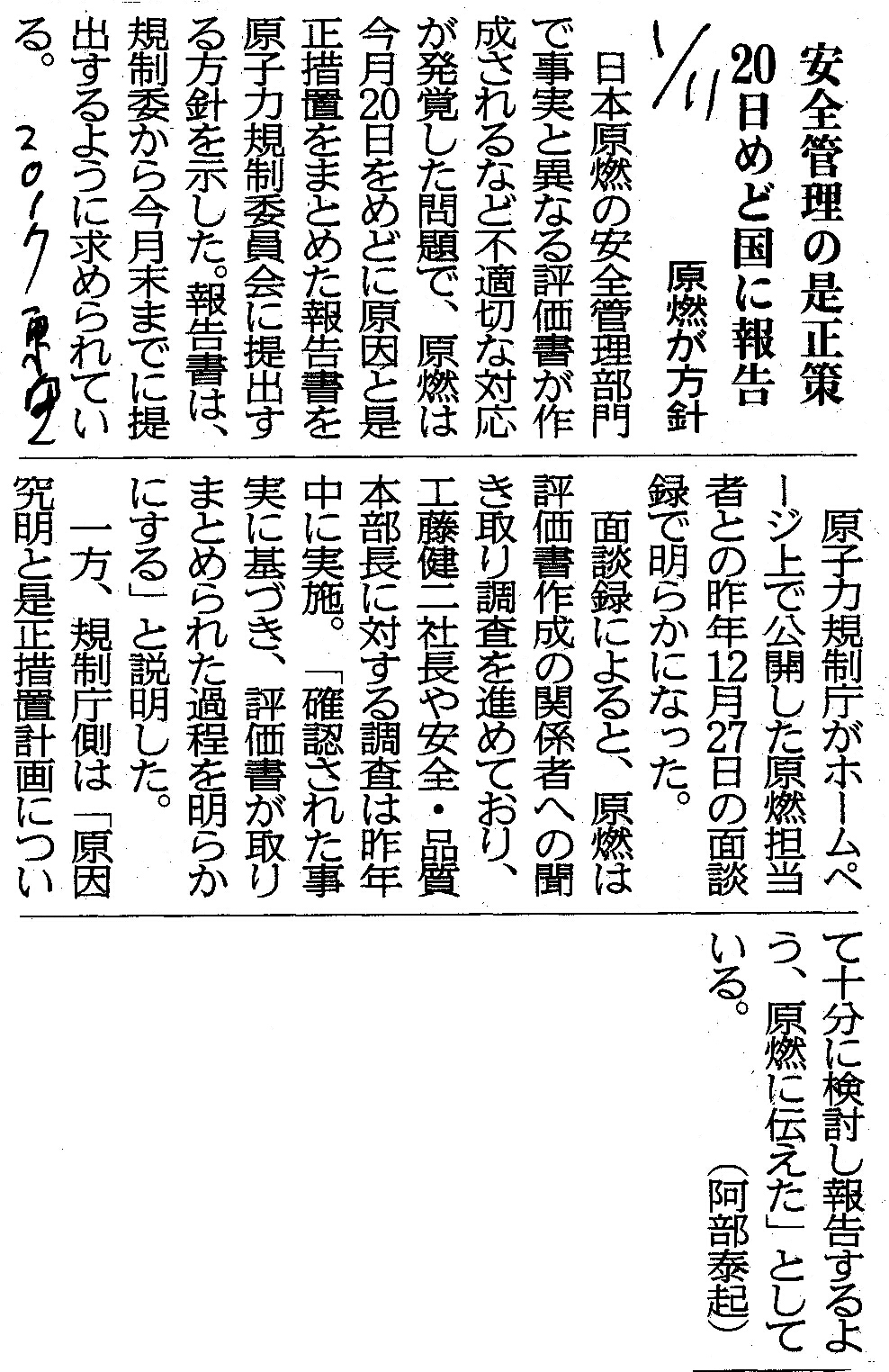 [2017_01_11_03]安全管理の是正策 20日めど国に報告 原燃が方針(東奥日報2017年1月11日)