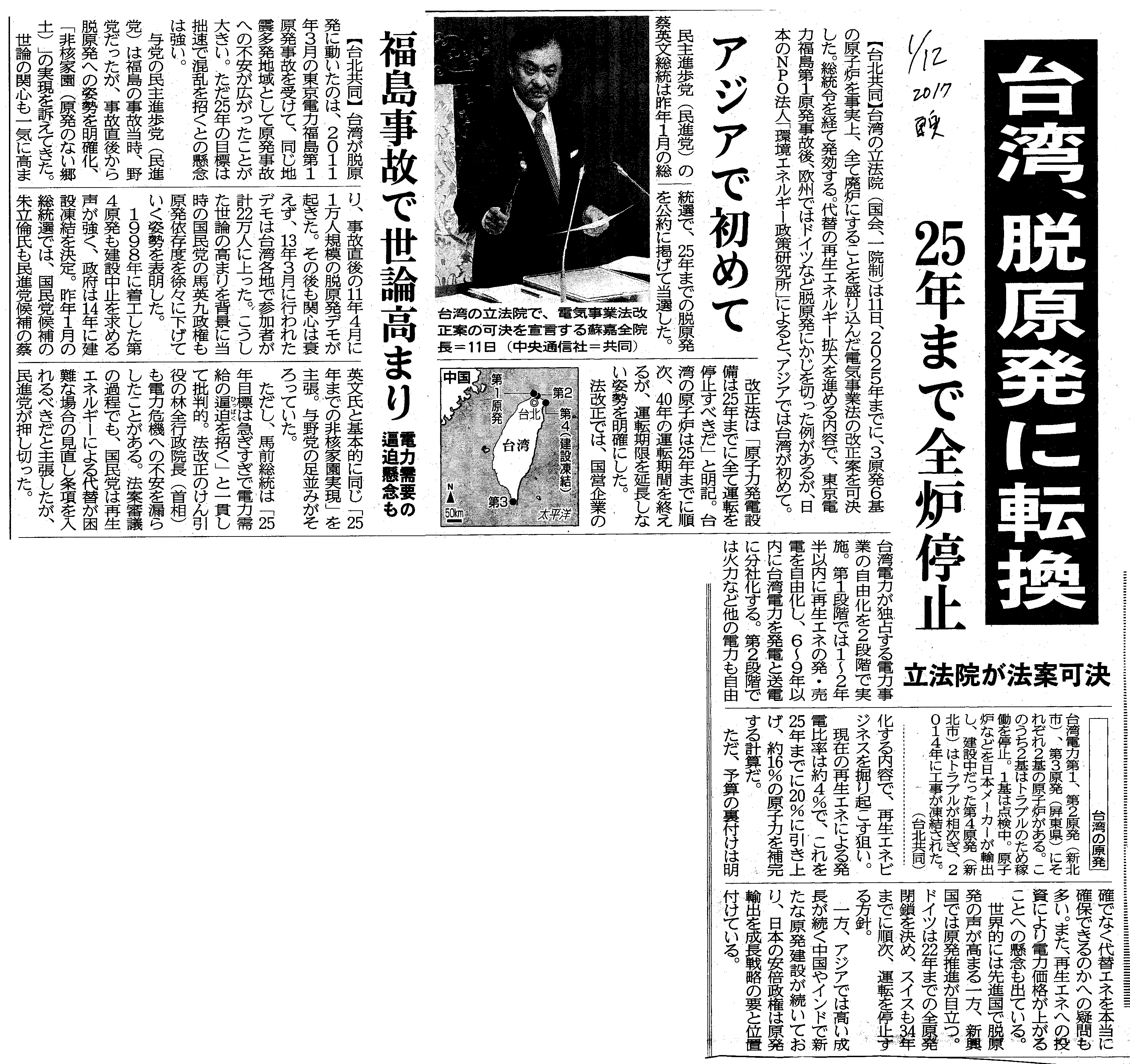 [2017_01_12_05]台湾、脱原発に転換 25年までに全炉停止 立法院が法案可決 アジアで初めて 福島事故で世論高まり 電力需要の逼迫懸念も(東奥日報2017年1月12日)