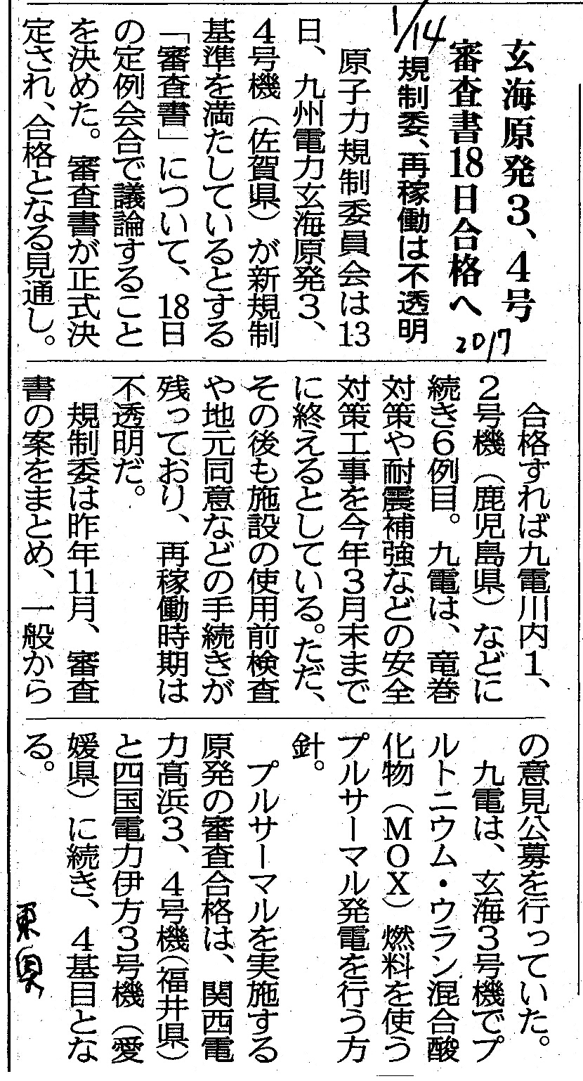[2017_01_14_02]玄海原発3、4号審査書18日合格へ 規制委、再稼働は不透明(東奥日報2017年1月14日)