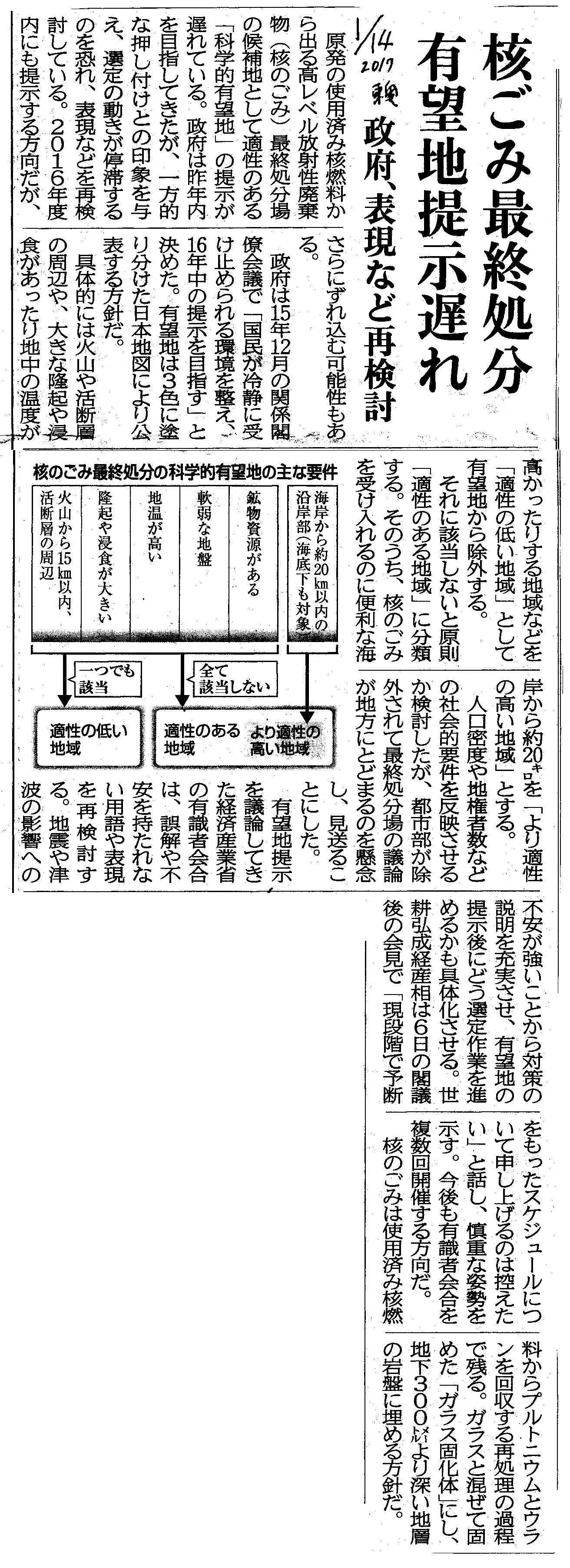 [2017_01_14_03]核ごみ最終処分 有望地掲示遅れ 政府、表現など再検討(東奥日報2017年1月14日)