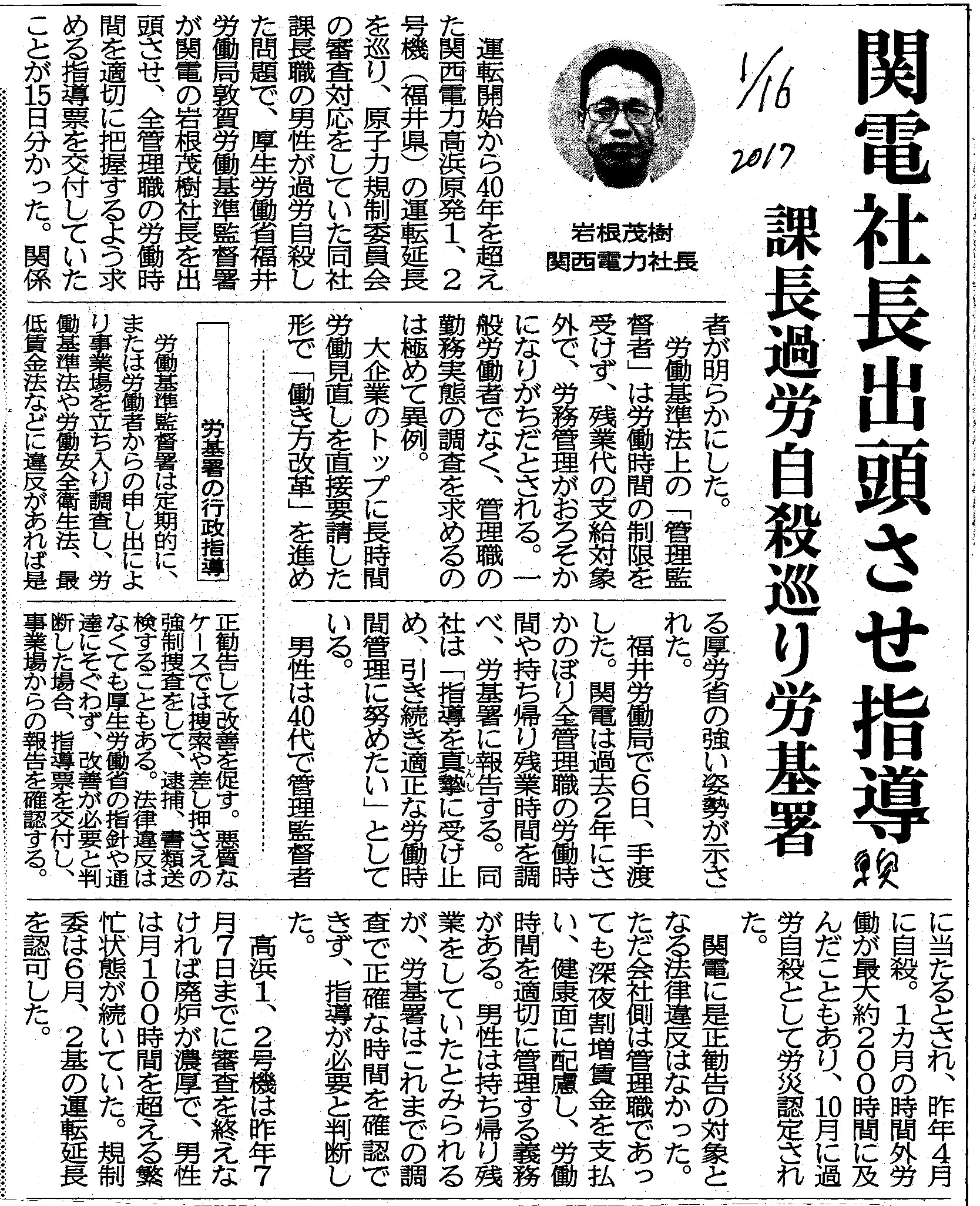 | [2017_01_16_01]関電社長出頭させ指導 課長過労自殺巡り 労基署(東奥日報2017年1月16日) |