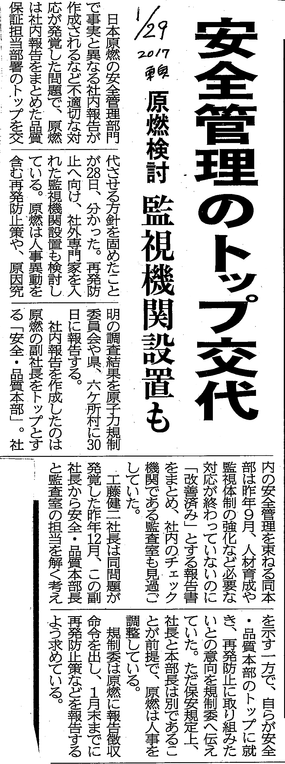 | [2017_01_29_02]安全管理のトップ交代 原燃検討 監視機関設置も(東奥日報2017年1月29日) |