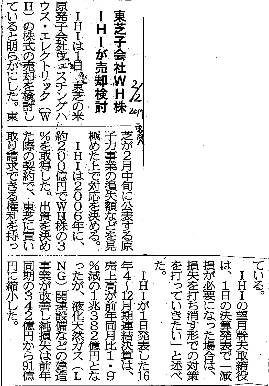 [2017_02_02_03]東芝子会社WH株 IHIが売却検討(東奥日報2017年2月2日)