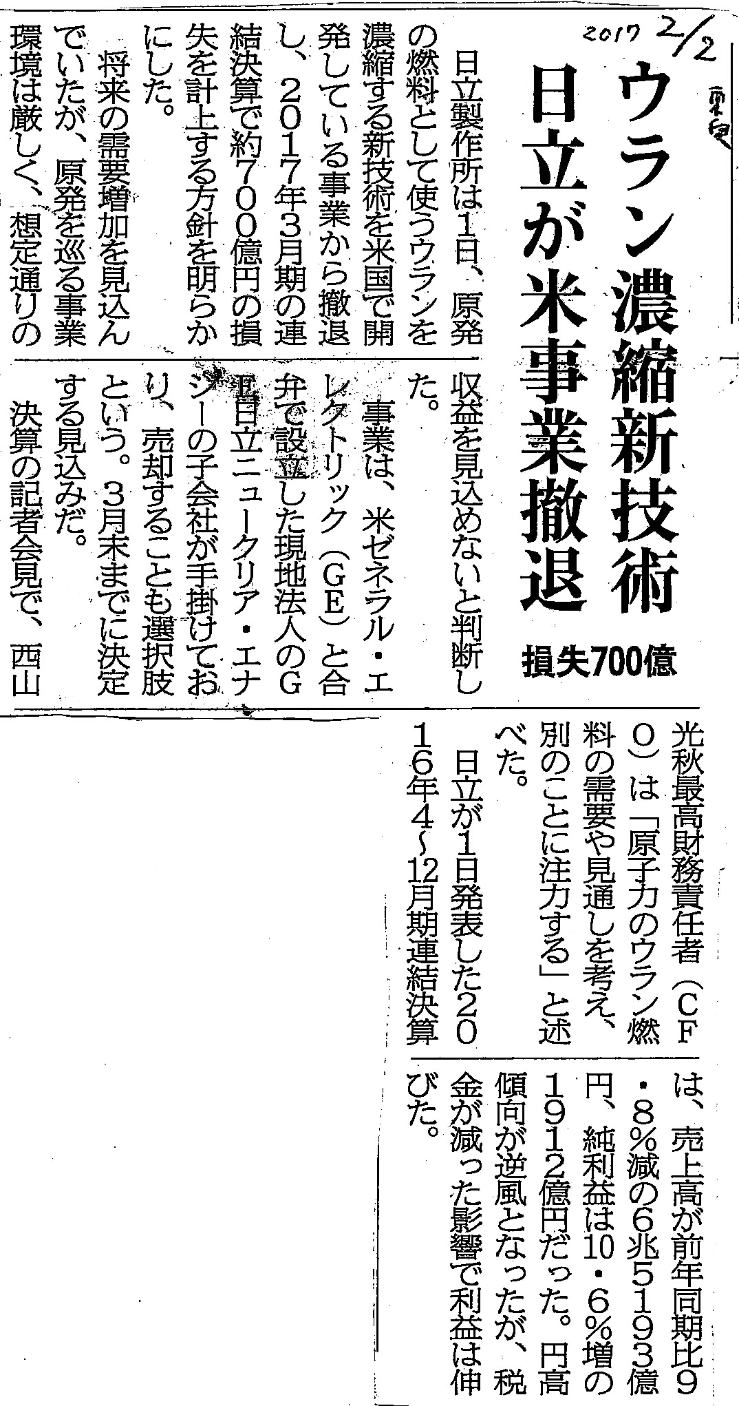 [2017_02_02_04]ウラン濃縮新技術 日立が米事業撤退 損失700億(東奥日報2017年2月2日)