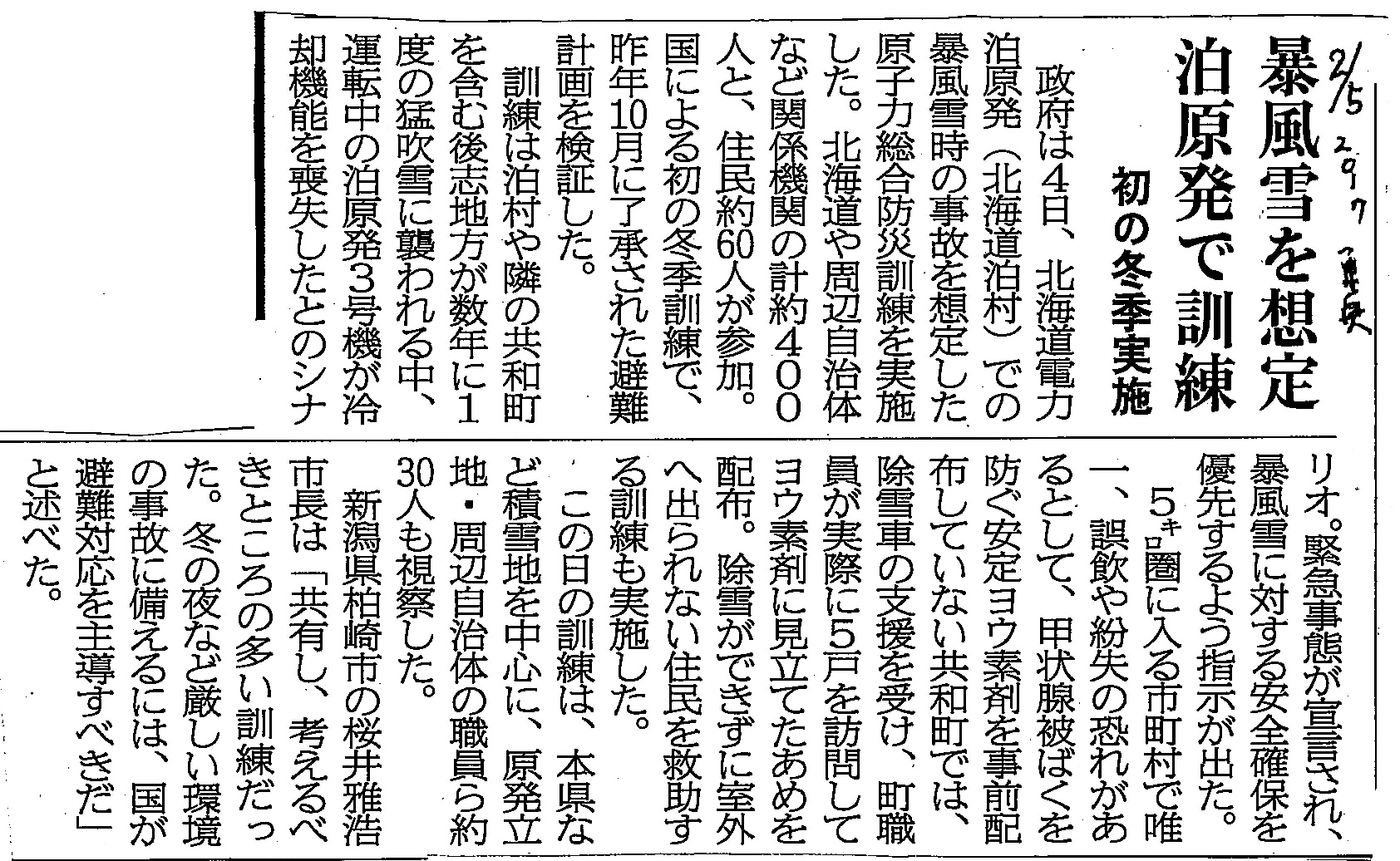 | [2017_02_05_03]暴風雪を想定 泊原発で訓練 初の冬季実施(東奥日報2017年2月5日) |