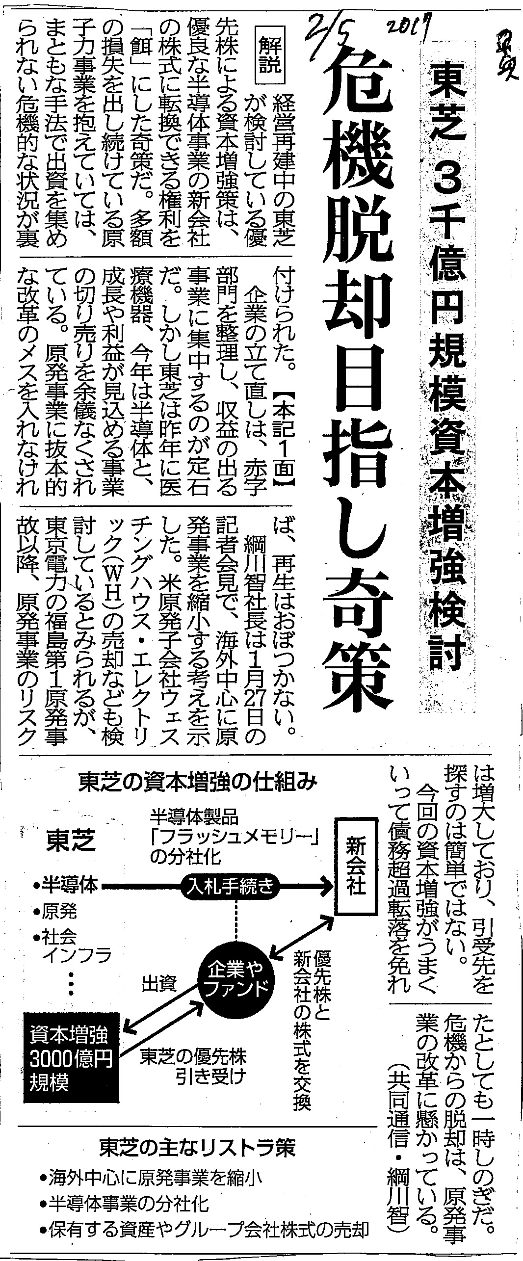 [2017_02_05_05]東芝 3千億円規模資本増強検討 危機脱却目指し奇策(東奥日報2017年2月5日)