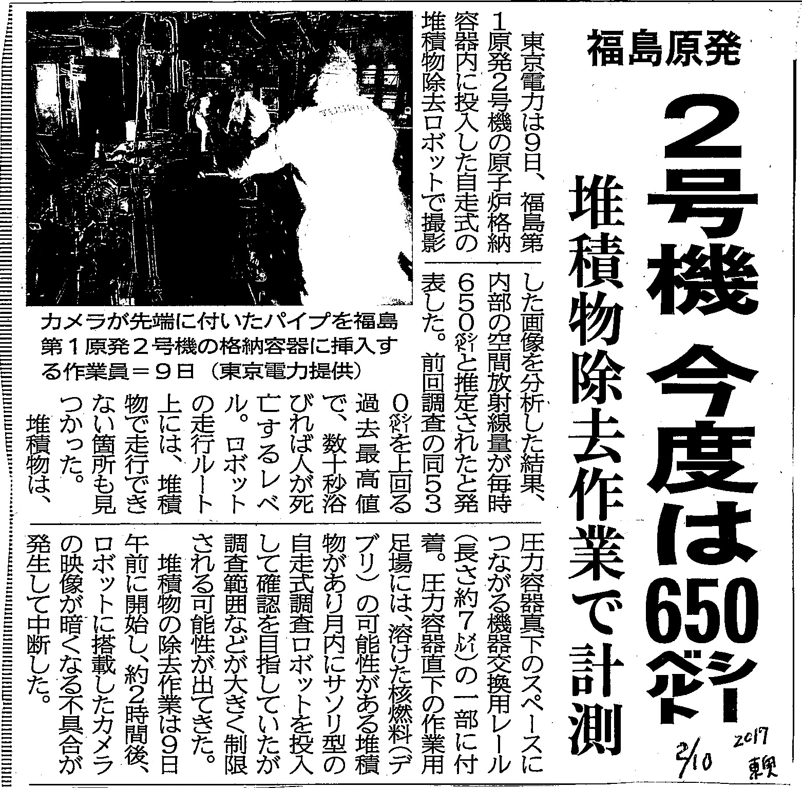 [2017_02_10_05]福島原発 2号機 今度は650シーベルト 堆積物除去作業で計測(東奥日報2017年2月10日)