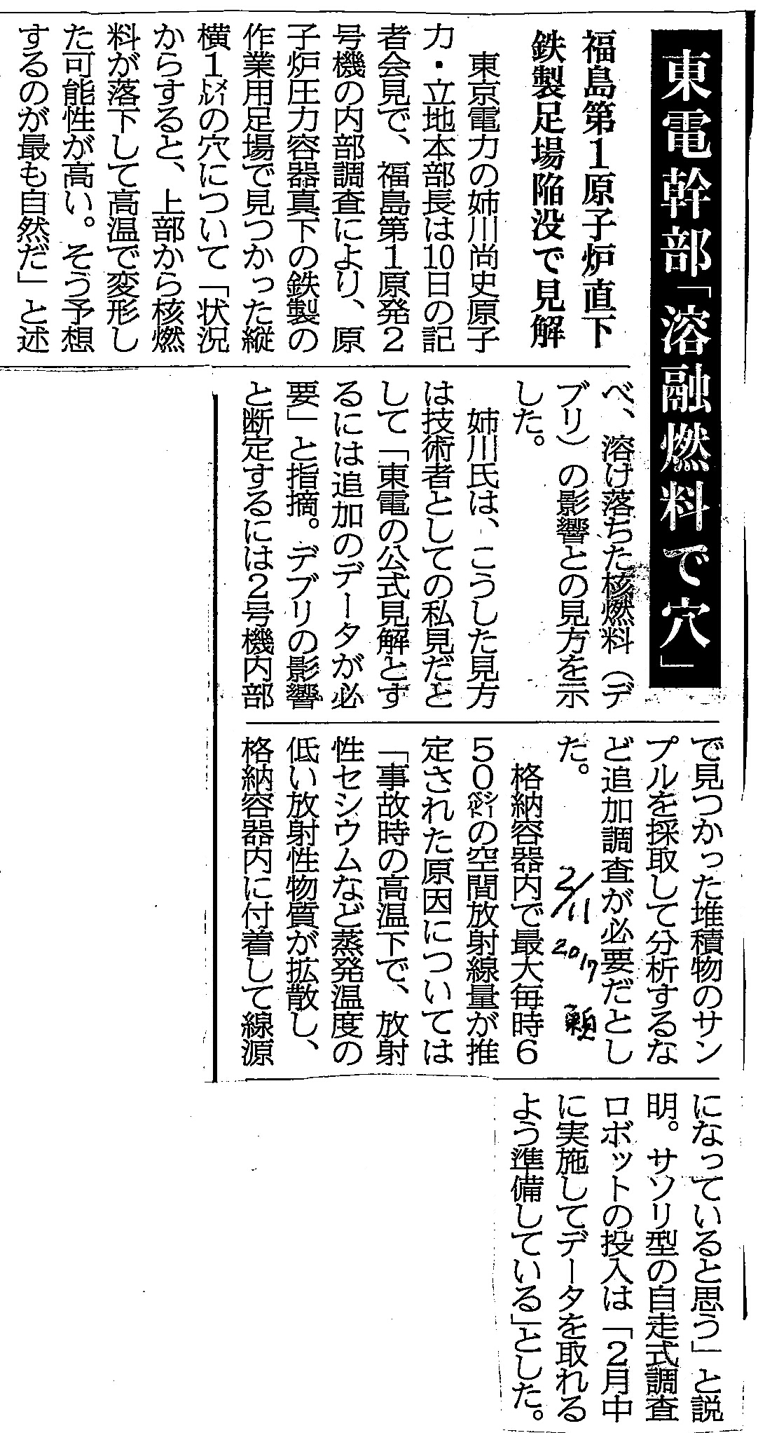 [2017_02_11_01]東電幹部「溶融燃料で穴」 福島第一原子炉直下鉄製足場陥没で見解(東奥日報2017年2月11日)