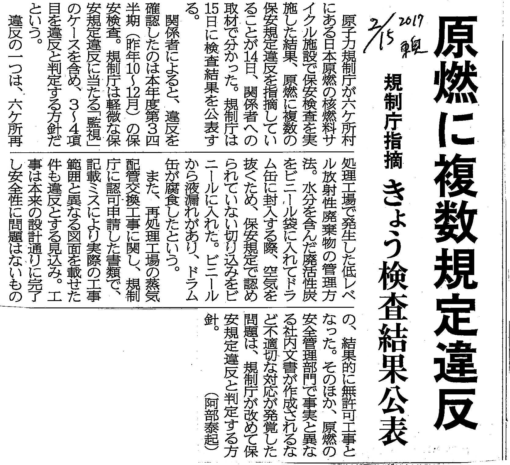 | [2017_02_15_06]原燃に複数規定違反 規制庁指摘 きょう検査結果公表(東奥日報2017年2月15日) |