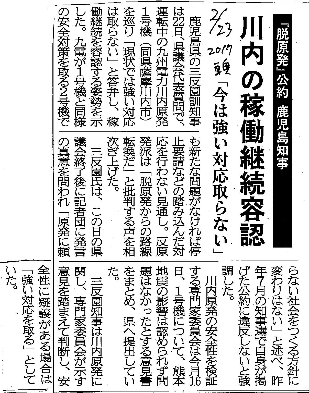 [2017_02_23_05]「脱原発」公約 鹿児島知事 川内の稼働継続容認 「今は強い対応取らない」(東奥日報2017年2月23日)