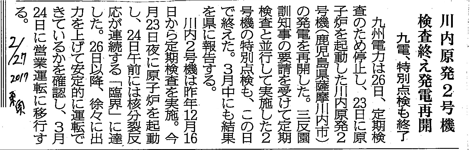 [2017_02_27_01]川内原発2号機 検査終え発電再開 九電、特別点検も終了(東奥日報2017年2月27日)