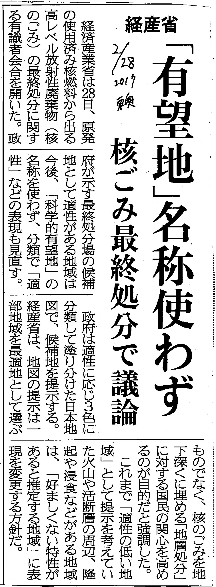 [2017_02_28_02]経産省 「有望地」名称使わず 核ごみ最終処分で議論(東奥日報2017年2月28日)