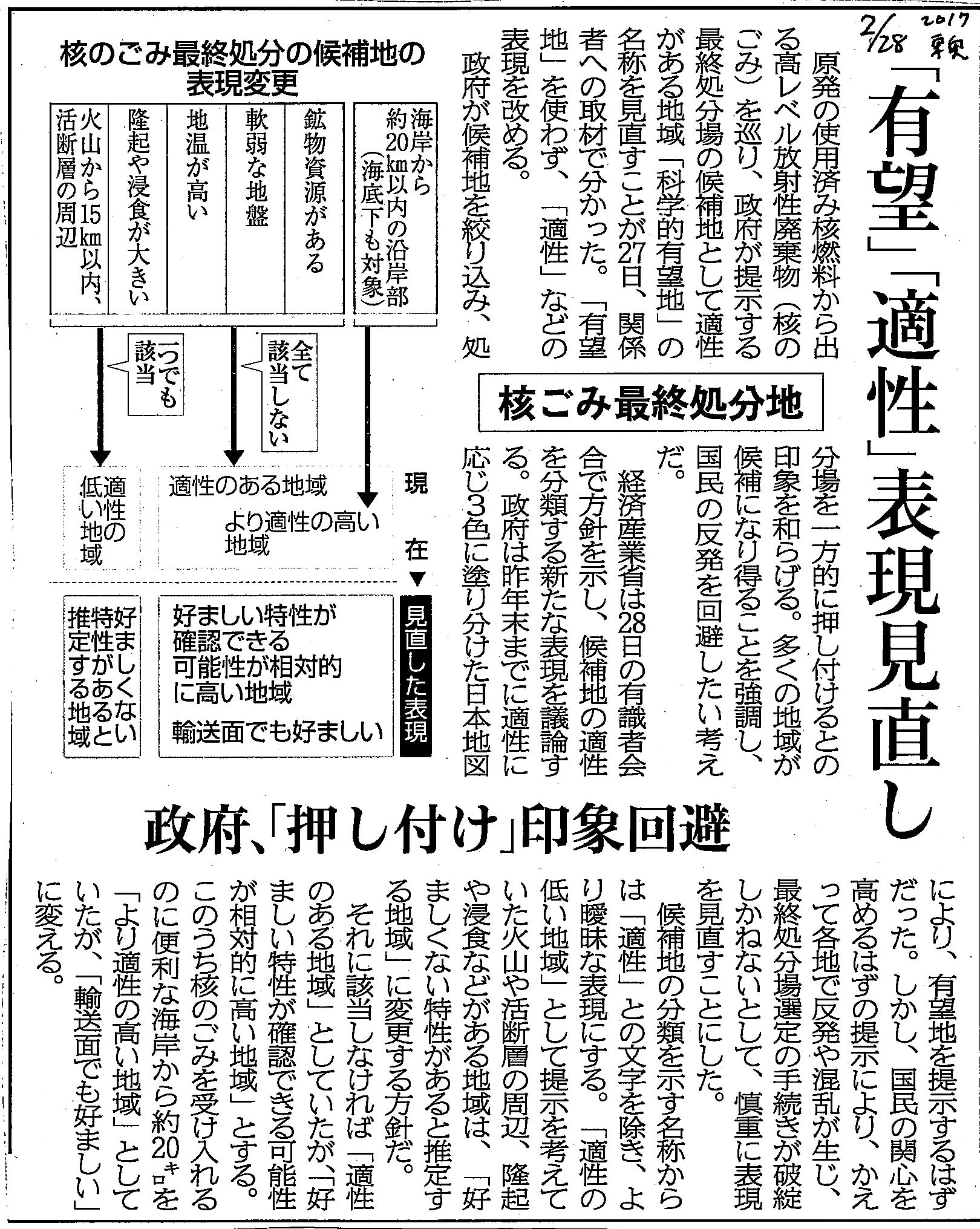 [2017_02_28_03]「有望」「適正」表現見直し 核ごみ最終処分場 政府、「押し付け」印象回避(東奥日報2017年2月28日)