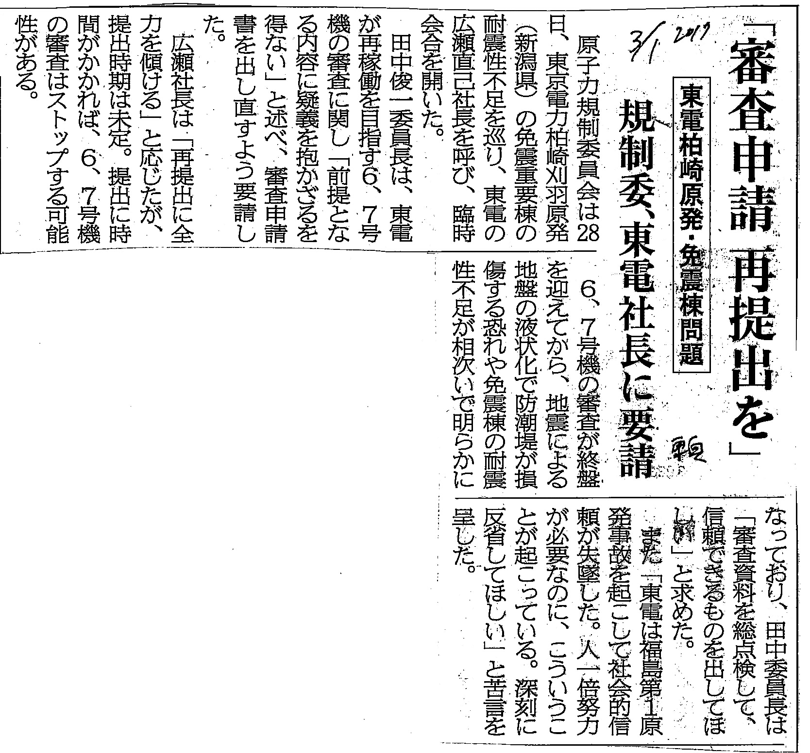 | [2017_03_01_02]「審査申請 再提出を」 東電柏崎原発・免震棟問題 規制委、東電社長に要請(東奥日報2017年3月1日) |