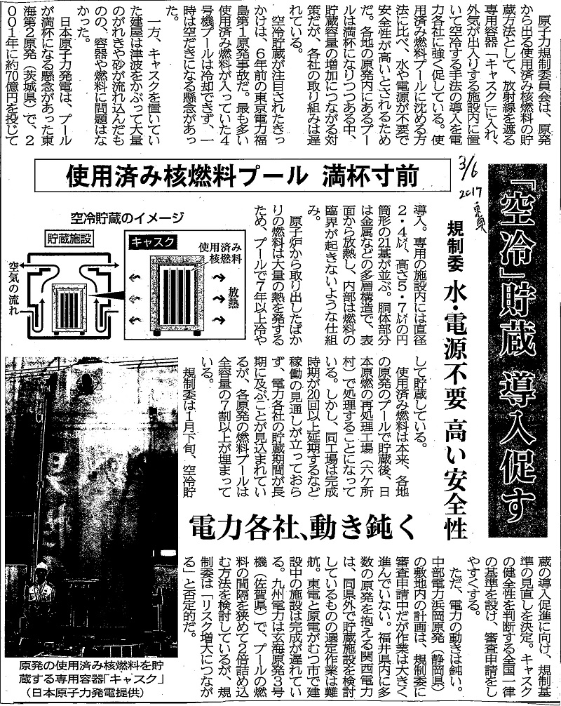 [2017_03_06_01]使用済み核燃料プール 満杯寸前 「空冷」貯蔵 導入促す 規制委 水・電源不要 高い安全性 電力会社、動き鈍く(東奥日報2017年3月6日)