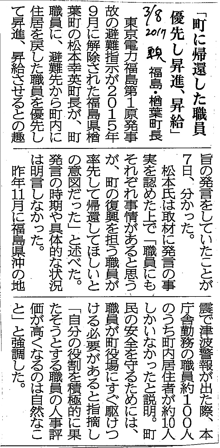 [2017_03_08_02]「町に帰還した職員優先し昇進、昇給」 福島・楢葉町長(東奥日報2017年3月8日)