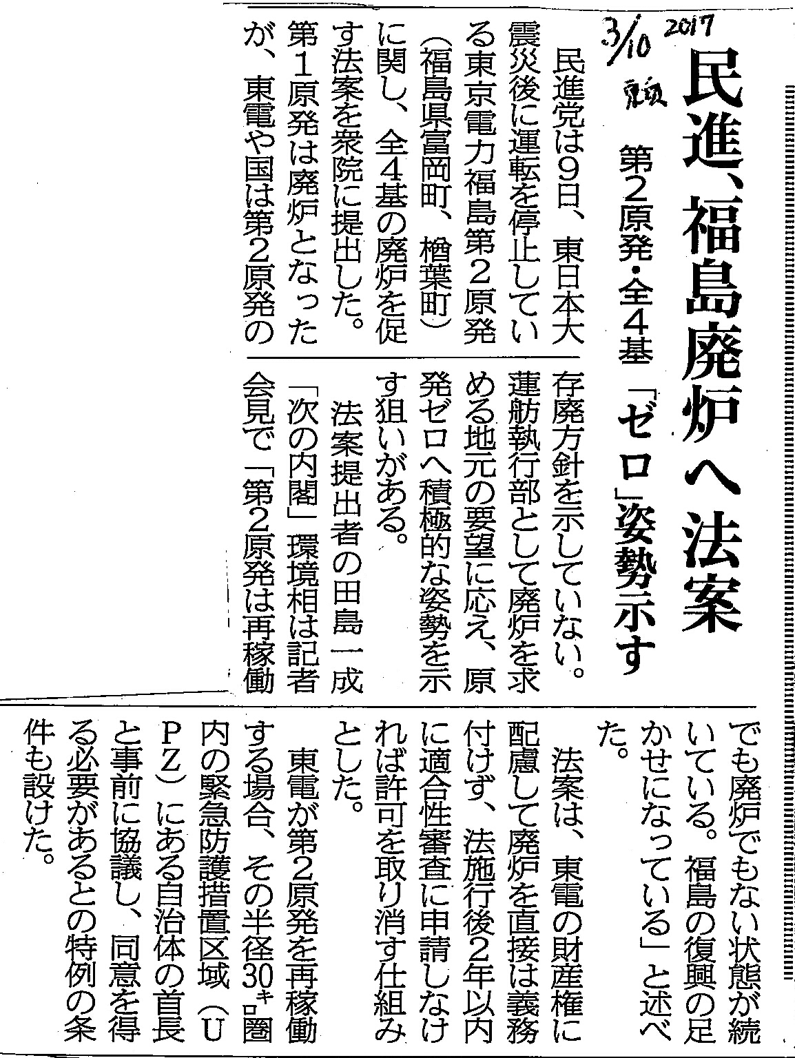 [2017_03_10_01]民進、福島廃炉へ法案 第2原発・全4基 「ゼロ」姿勢示す(東奥日報2017年3月10日)
