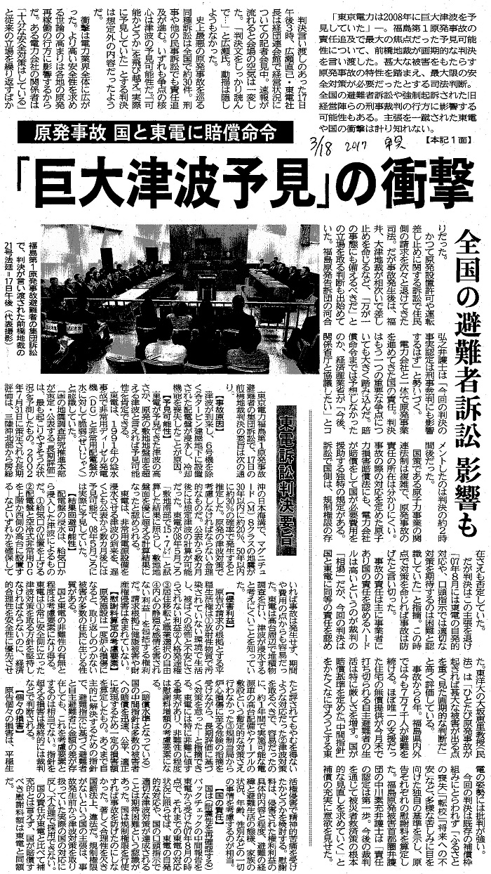 | [2017_03_18_06]原発事故 国と東電に賠償命令 「巨大津波予見」の衝撃 全国の避難者訴訟 影響も 東電訴訟判決要旨(東奥日報2017年3月18日) |