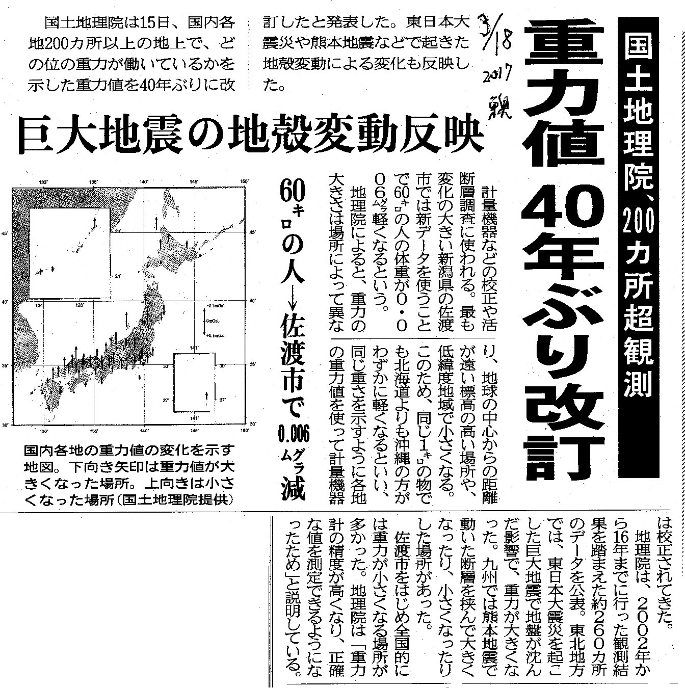 [2017_03_18_10]国土地理院、200カ所超観測 重力値 40年ぶり改訂 巨大地震の地殻変動反映 60キロの人ー>佐渡市で0.006グラム減(東奥日報2017年3月18日)