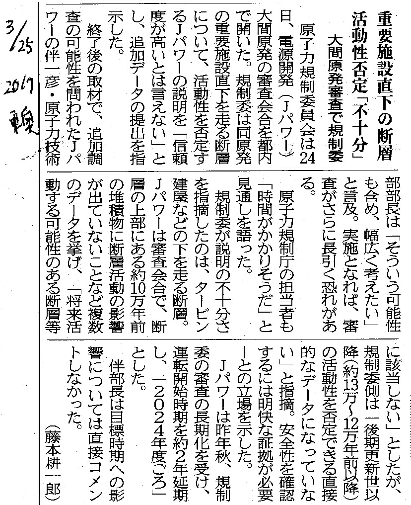 | [2017_03_25_04]重要施設直下の断層 活動性否定「不十分」 大間原発審査で規制委(東奥日報2017年3月25日) |
