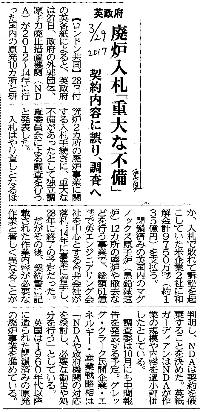 [2017_03_29_04]英政府 廃炉入札「重大な不備」 契約内容に誤り、調査へ(東奥日報2017年3月29日)