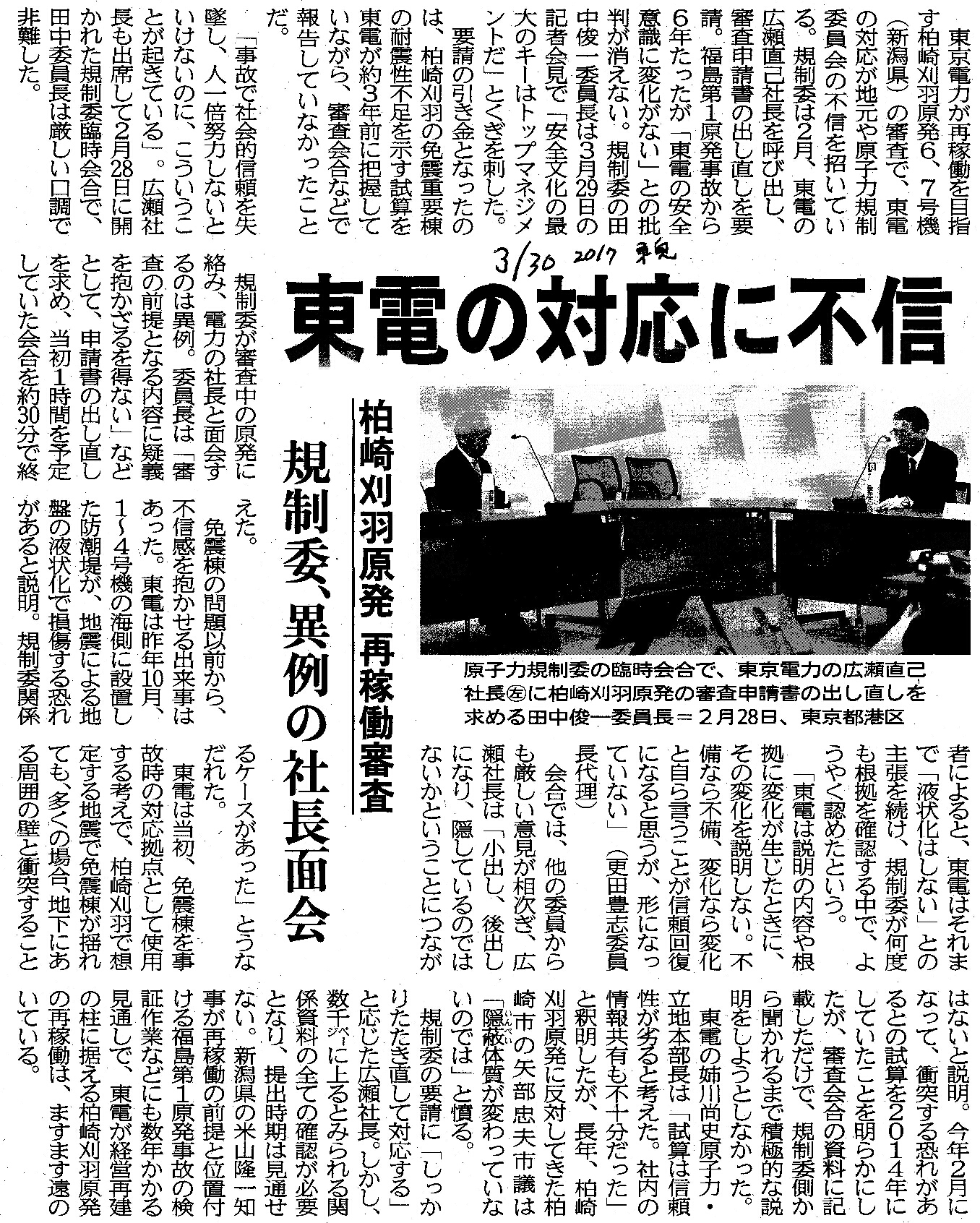 | [2017_03_30_07]東電の対応に不信 柏崎刈羽原発 再稼働審査 規制委、異例の社長面会(東奥日報2017年3月30日) |