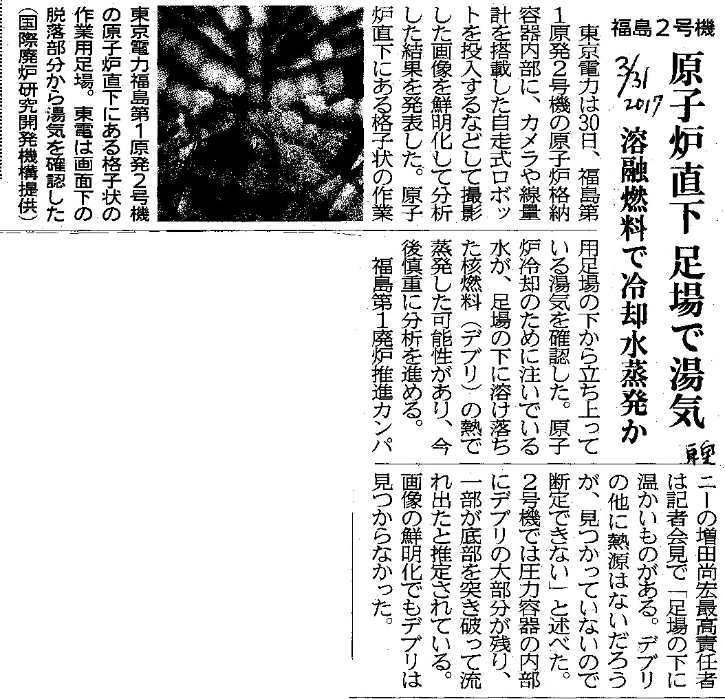 [2017_03_31_06]福島2号機 原子炉直下 足場で湯気 溶融燃料で冷却水蒸発か(東奥日報2017年3月31日)