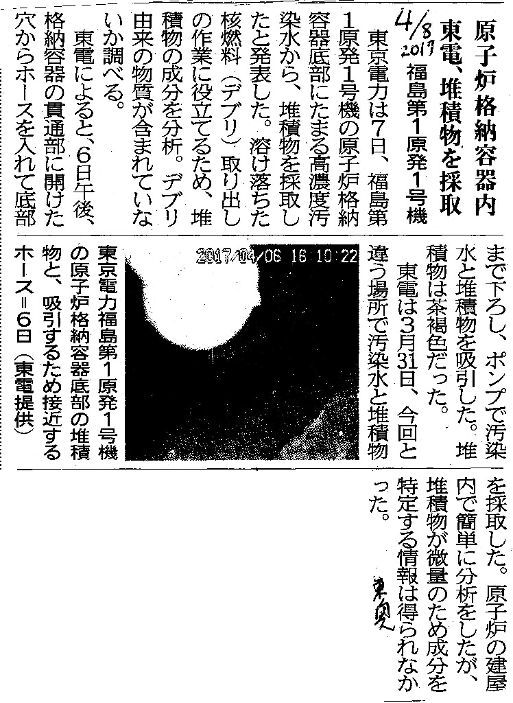 [2017_04_08_03]原子炉格納容器内 東電、堆積物を採取 福島第一原発一号機(東奥日報2017年4月8日)