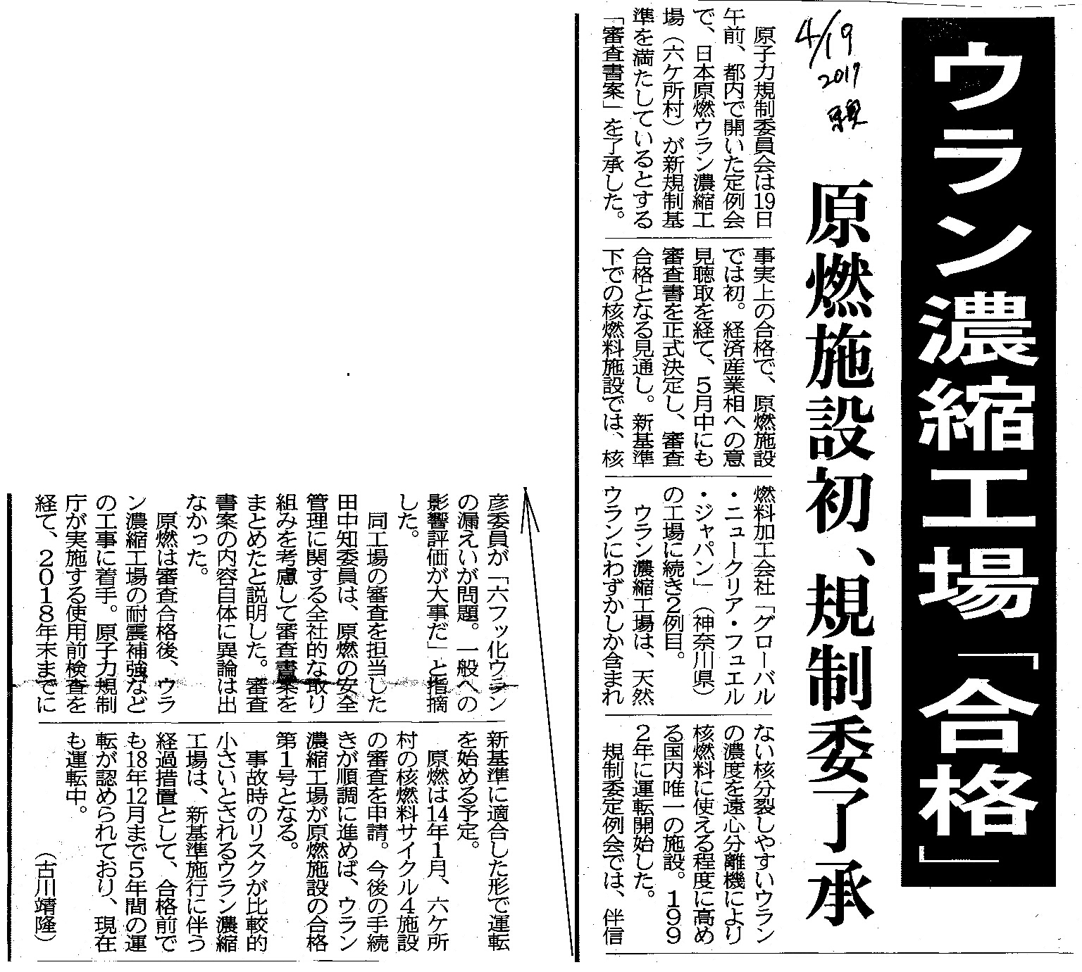 | [2017_04_19_05]ウラン濃縮工場「合格」 原燃施設初、規制委了承(東奥日報2017年4月19日) |