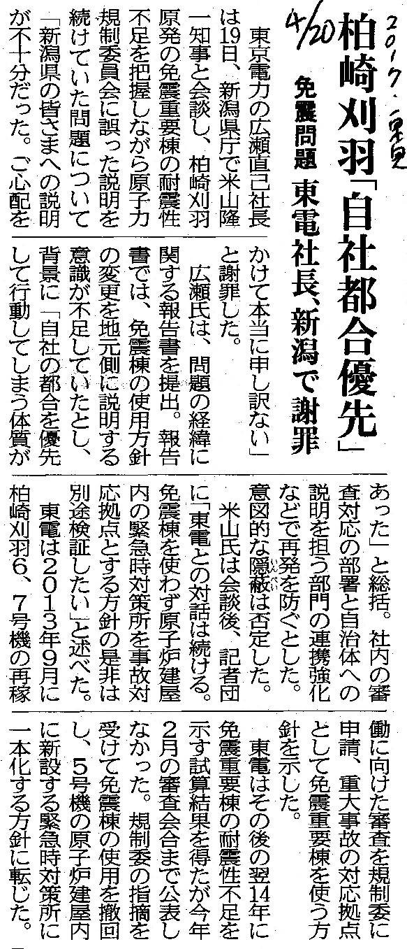 [2017_04_20_02]柏崎刈羽「自社都合優先」 免震問題 東電社長、新潟で謝罪(東奥日報2017年4月20日)