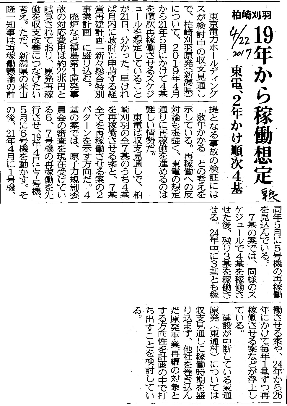 [2017_04_22_01]柏崎刈羽 19年から稼働想定 東電、2年かけ順次4基(東奥日報2017年4月22日)