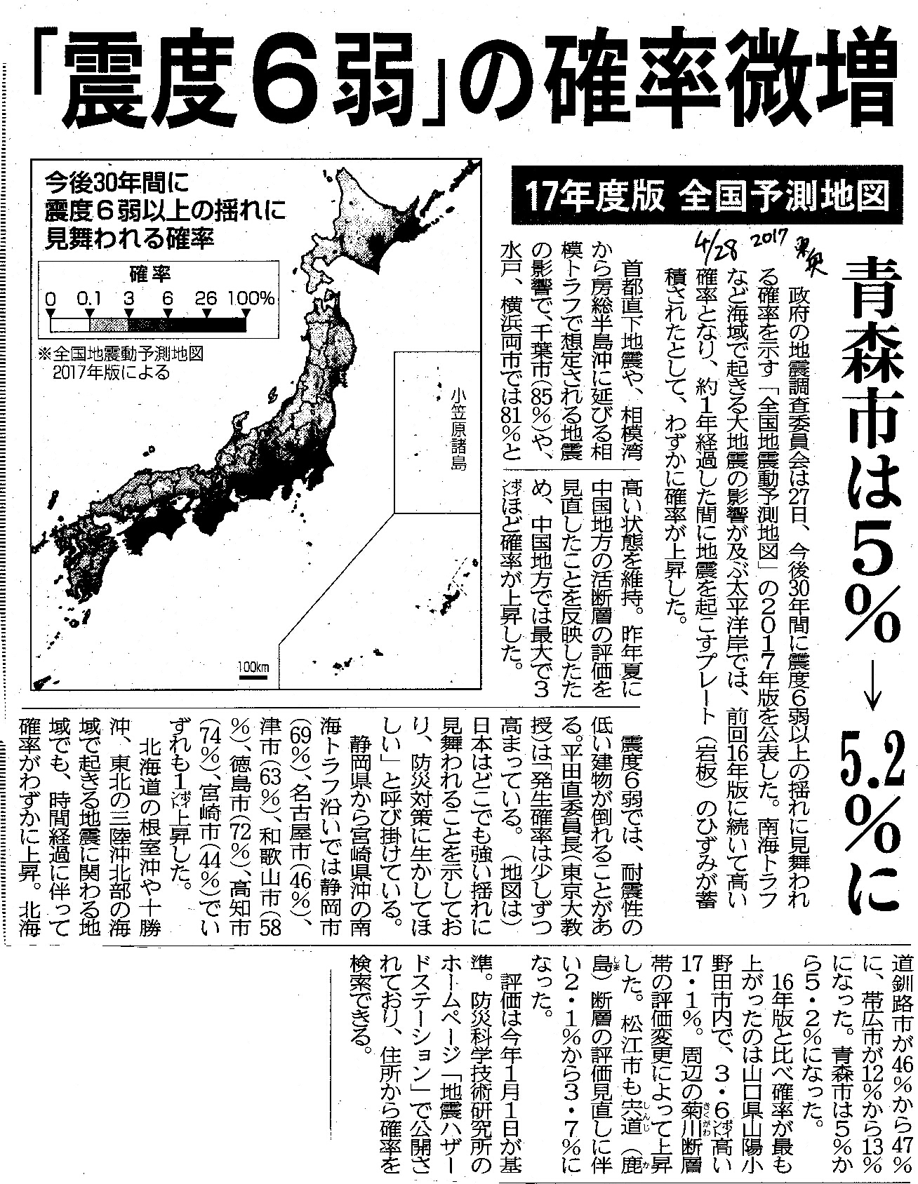 | [2017_04_28_02]「震度6弱」の確率微増 17年度版 全国予測地図 青森市は5%−>5.2%に(東奥日報2017年4月28日) |