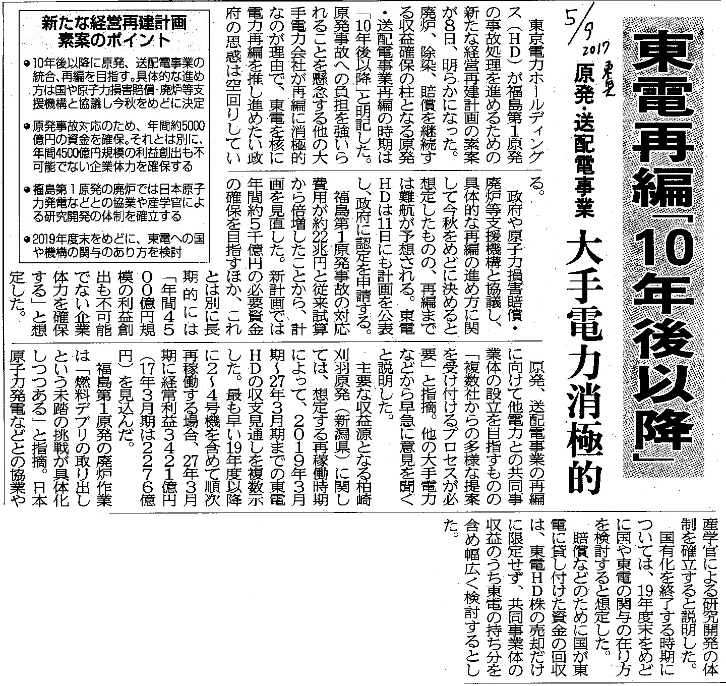 [2017_05_09_01]東電再編「10年後以降」 原発・送配電事業 大手電力消極的(東奥日報2017年5月9日)