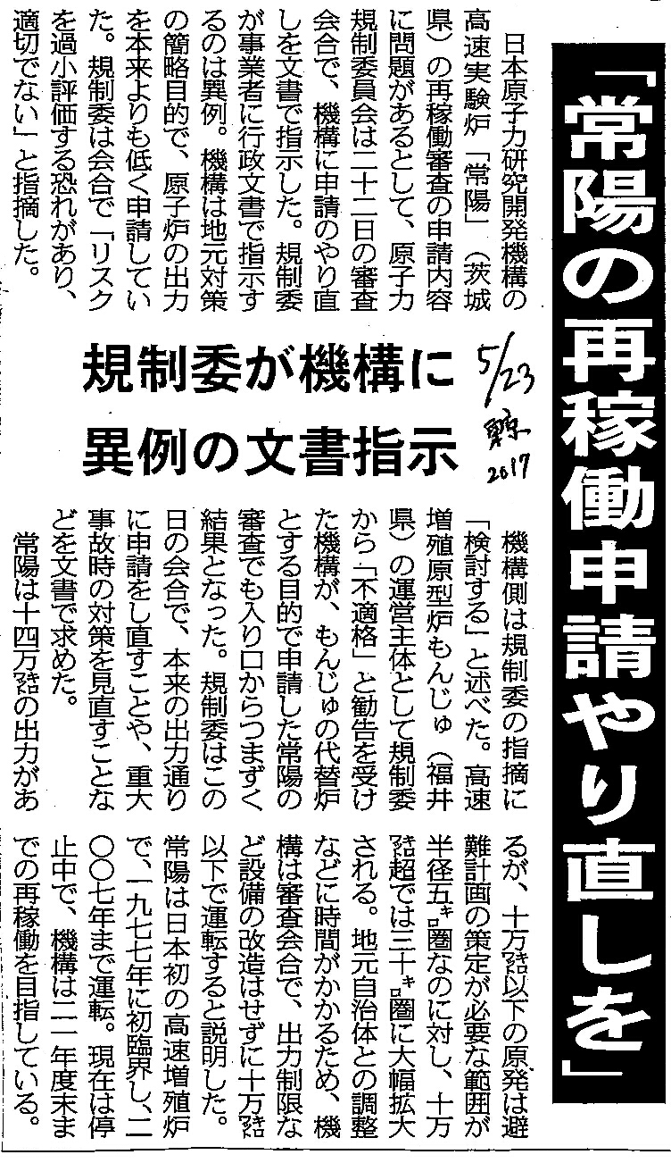 [2017_05_23_01]「常陽の再稼働申請やり直しを」 規制委が機構に 異例の文書指示(東奥日報2017年5月23日)
