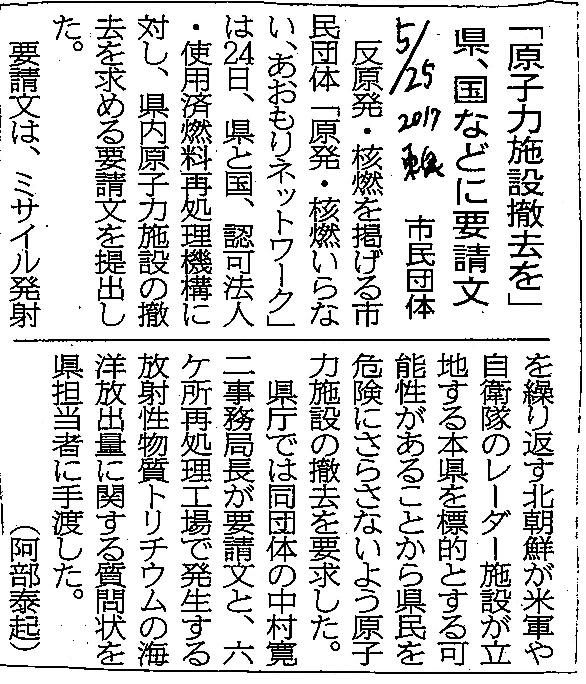 | [2017_05_25_04]「原子力施設撤去を」 県、国などに要請文 市民団体(東奥日報2017年5月25日) |
