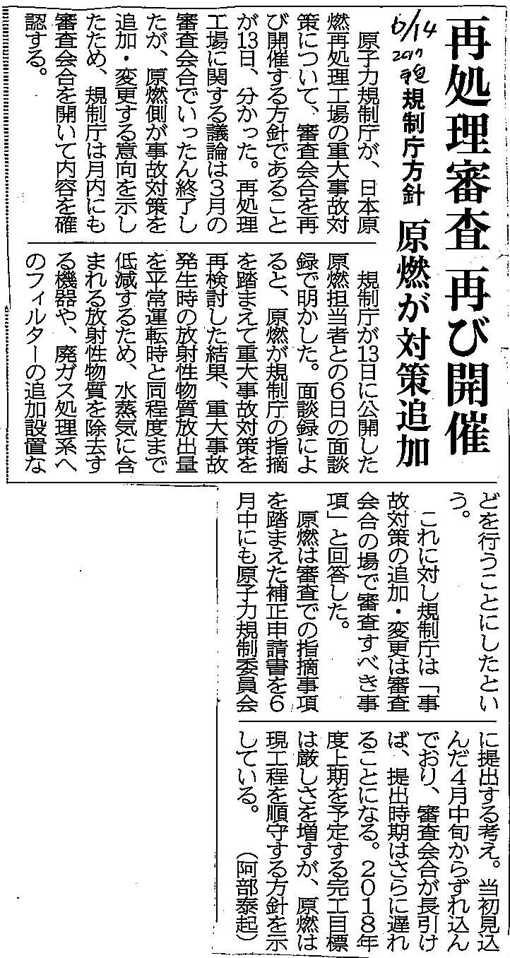 | [2017_06_14_06]再処理審査 再び開催 規制庁方針 原燃が対策追加(東奥日報2017年6月14日) |